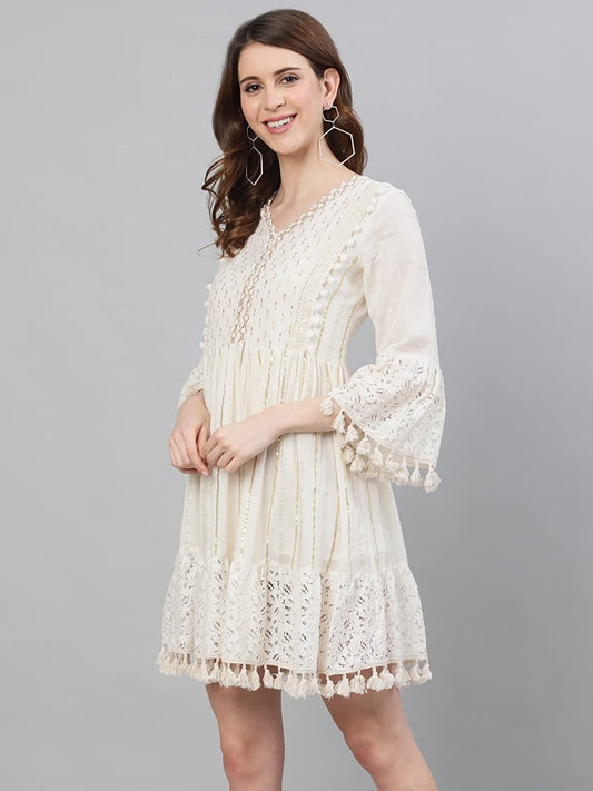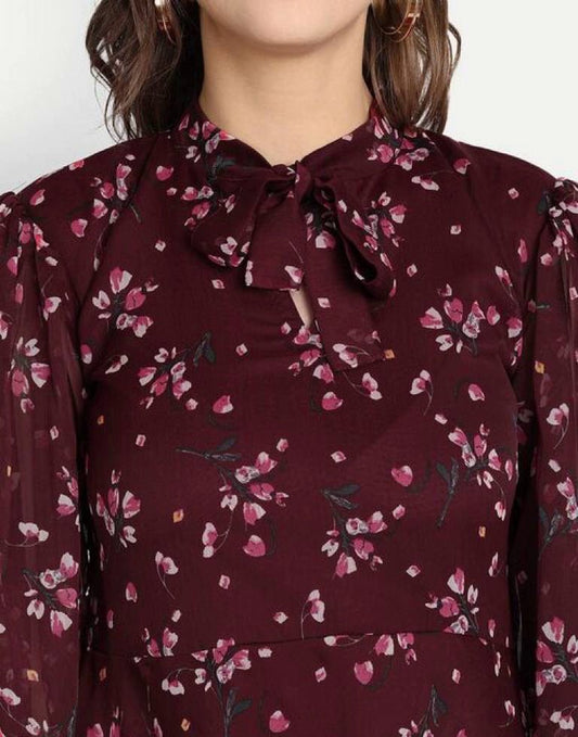 Maroon Puff Sleeved Printed Mini Fit and Flare Dress