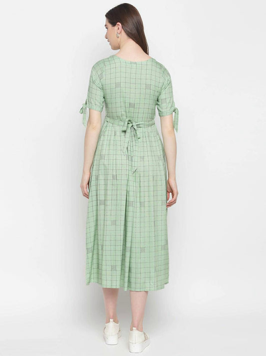 Pistachio Green Coloured Chequered Print Midi Fit Dress