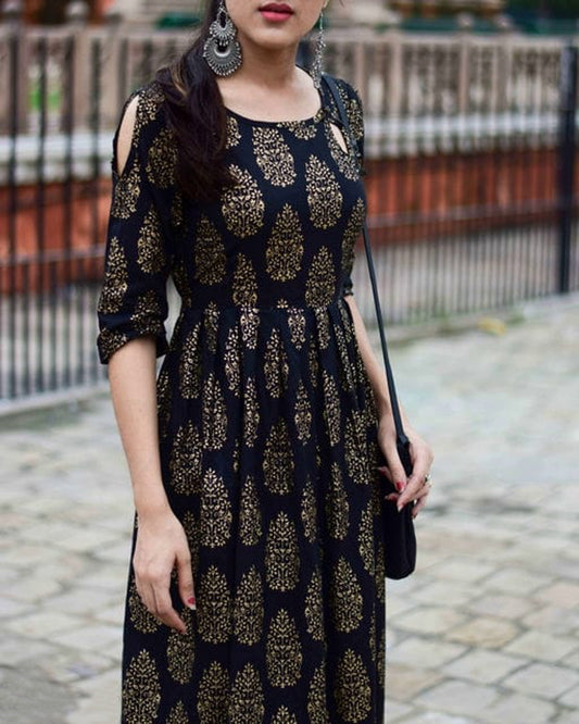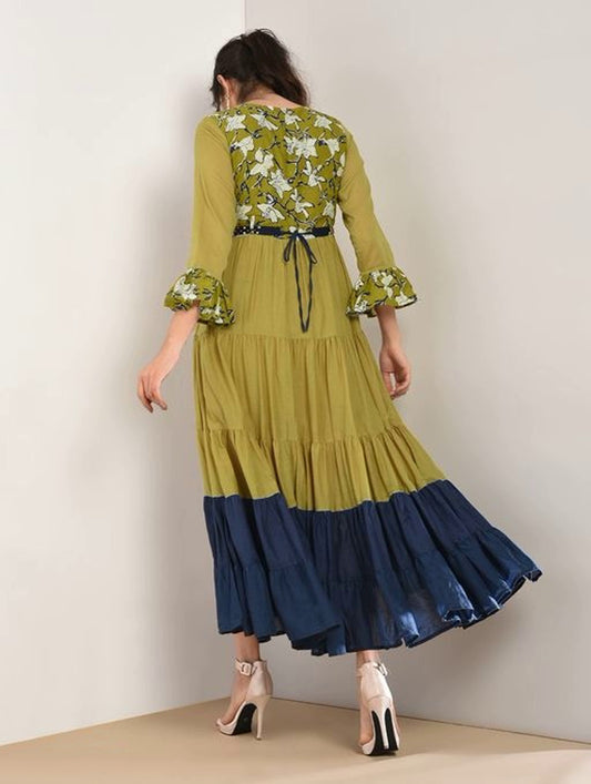 Women's Olive Green and Blue Ruffled Cotton Dress