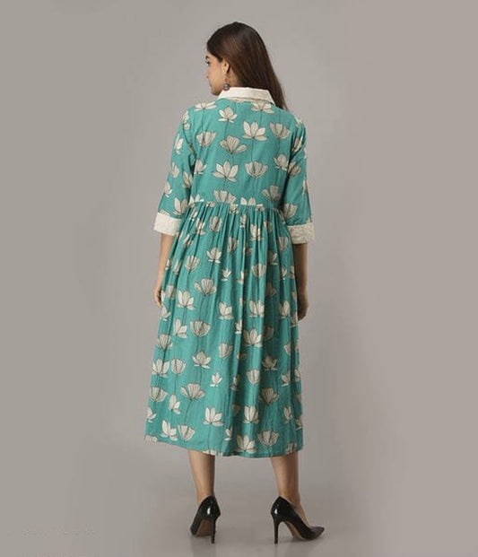 Sea Green Printed Cotton A-line Shirt Dress