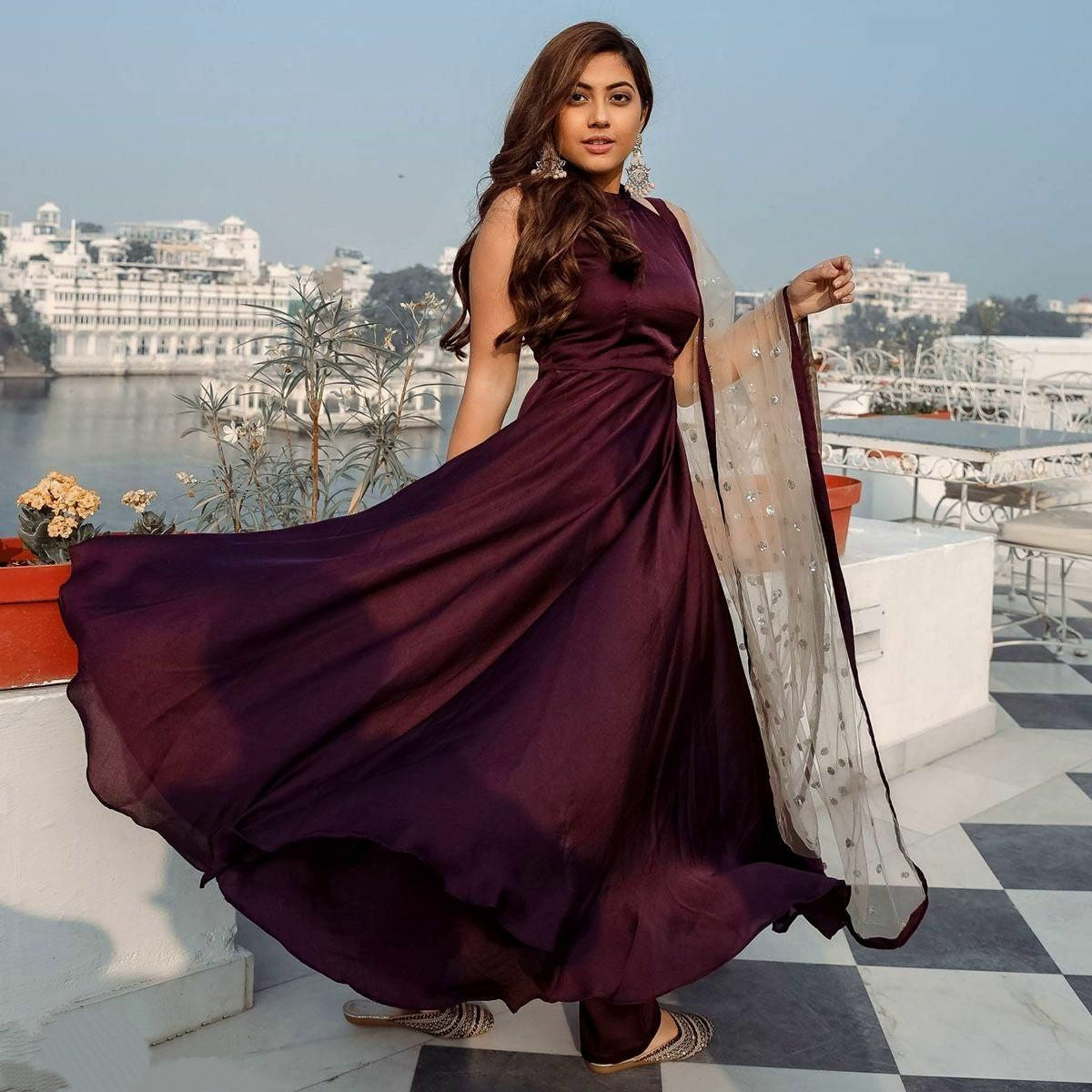Wine Coloured Georgette Anarkali Kurta Set, has a mandarin neck, sleeveless kurta, asymmetric hem, no side slits with pants and contrasting Dupatta