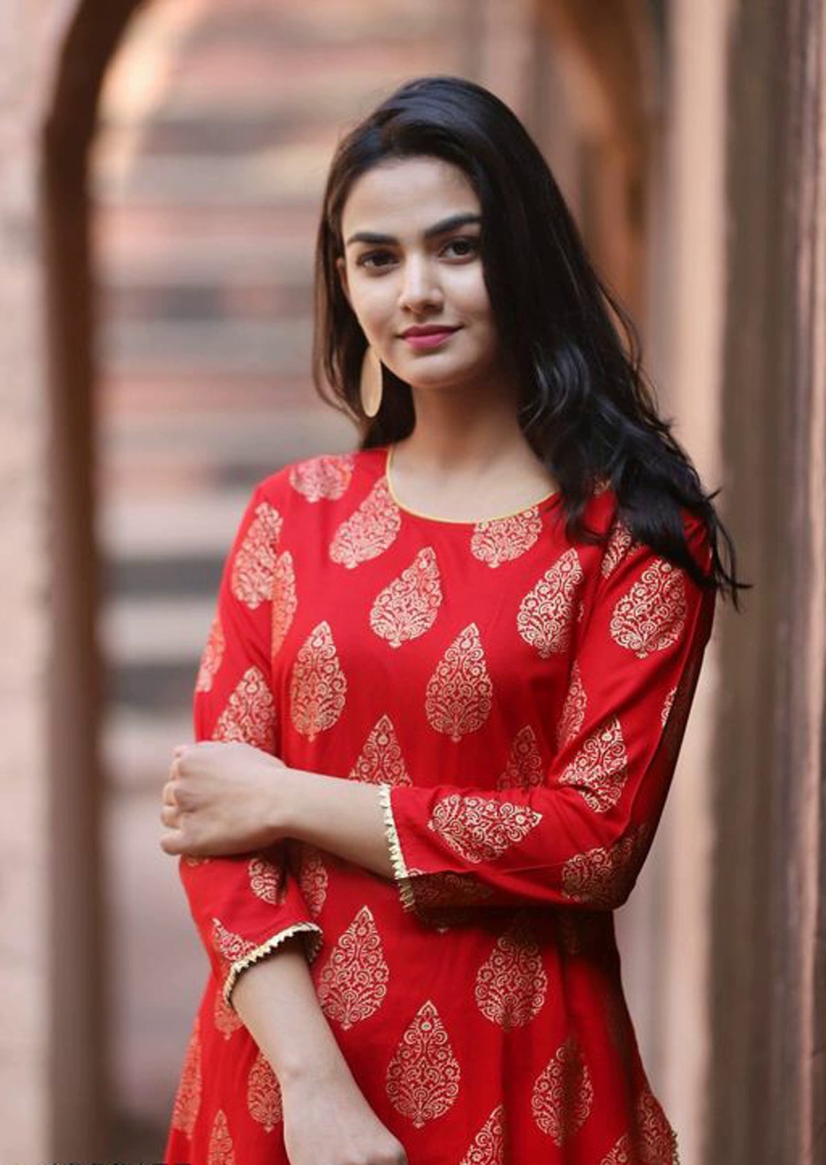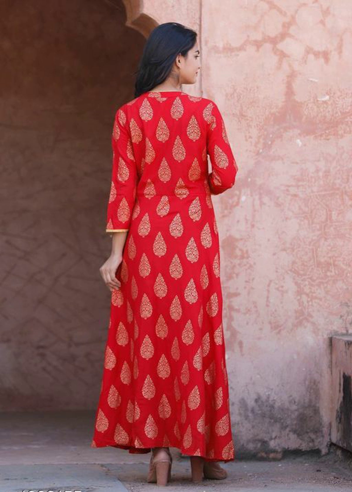 Red printed straight kurta, has round neck, three-quarter sleeves, straight hem, side slits, with palazzos