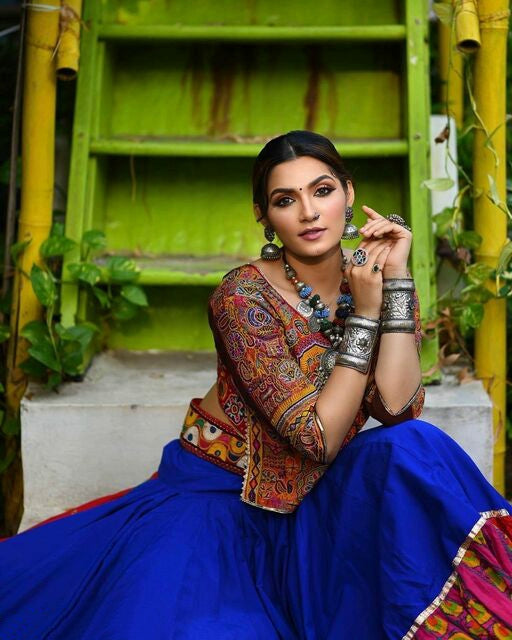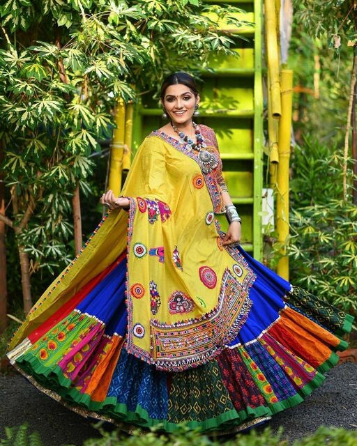 Blue and Yellow Navratri Silk Lehenga choli comes with a dupatta and Fabric blouse. This designer semi stitched lehenga has a concealed side tie-up, flared 4 m ghera, and embellished embroidered dupatta has lacework along the border.