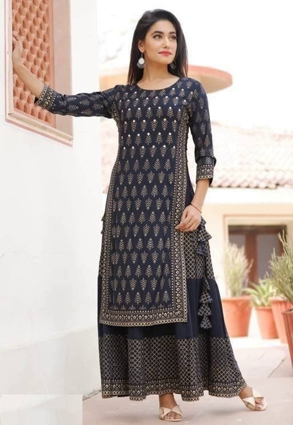 Women's Attractive Double Layered Navy Blue kurta , has a round neck and three-quarter sleeves. 2 slits on either sides.