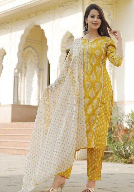 Women's Printed Cotton Kurta Set with Pants has a round neck and three-fourth sleeves, 2 slits on either side, accompanied by a beautiful printed dupatta