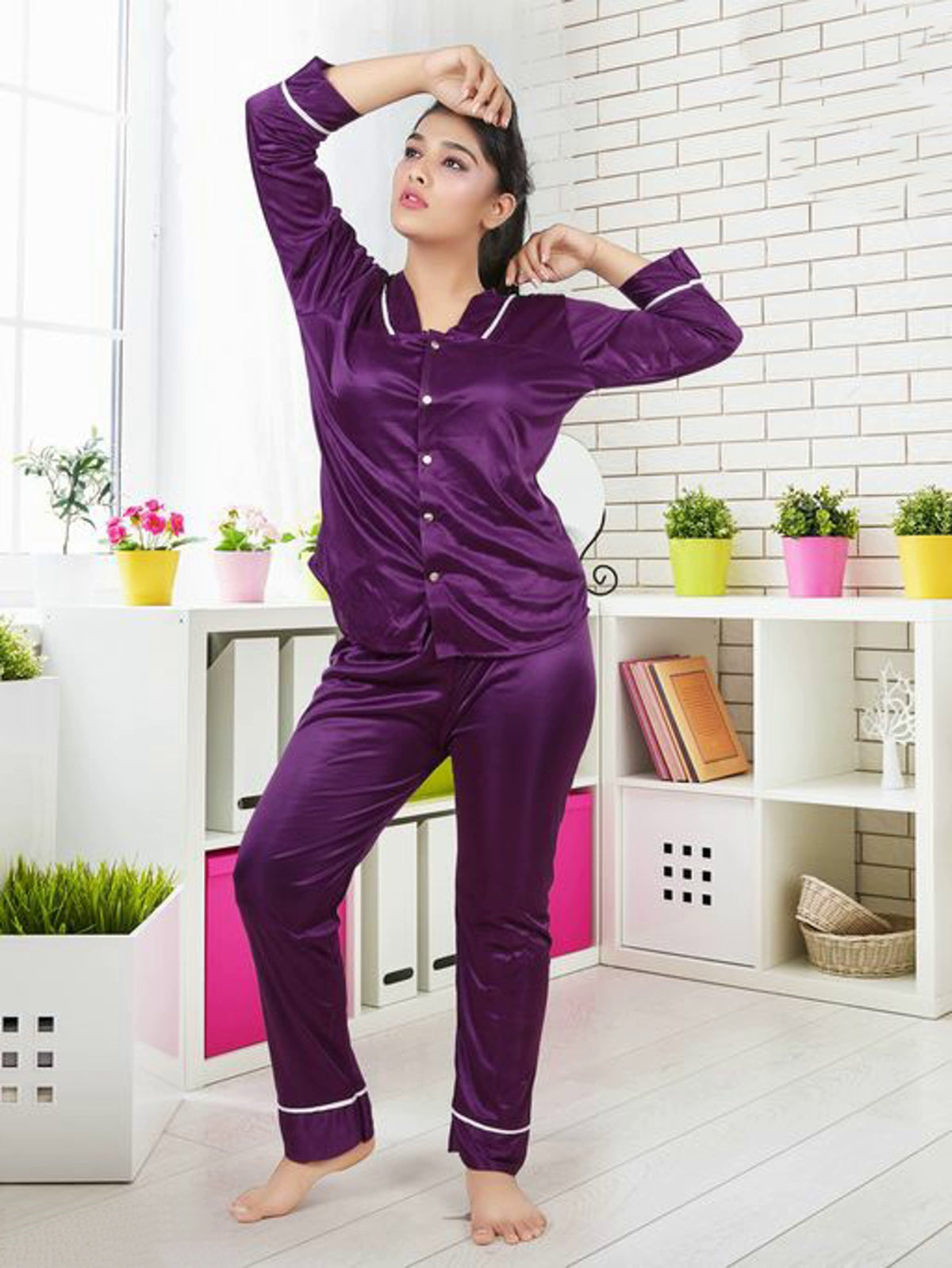 Purple Solid Sleepwear Consist Of Straight Short Kurta & Lounge Purple, Printed Kurta Has A Collared Neck,Three-Quarter Sleeves, Round Hem, Side Slits